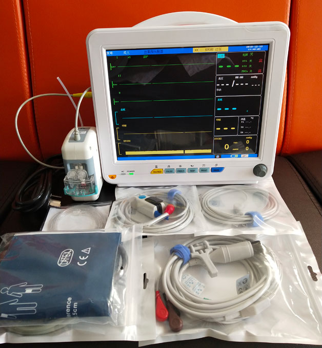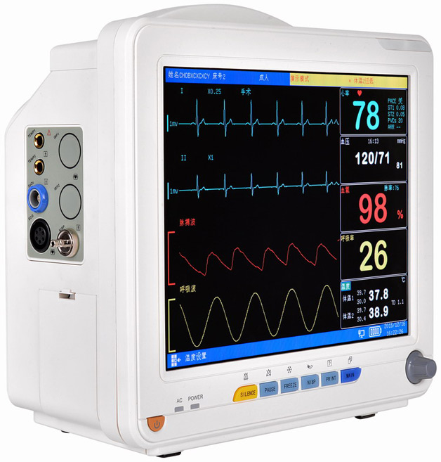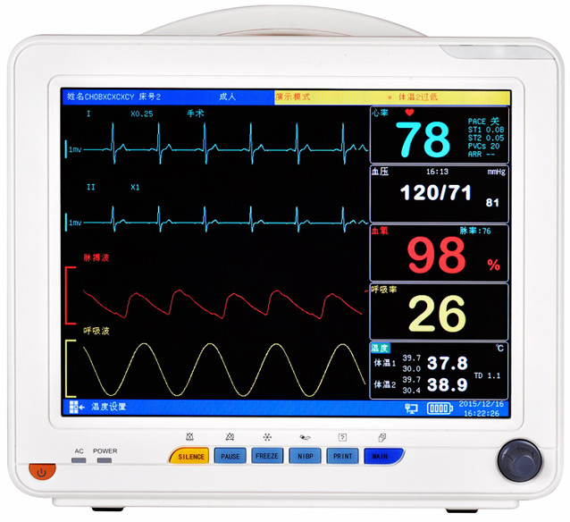多參監(jiān)護儀采用進口原裝TFT高亮度真彩液晶屏,整機界面清晰直觀,體積小﹑重量輕。對于成人及兒童均適用,可同時連續(xù)地對患者的心電圖、心率、無創(chuàng)血壓(收縮壓、舒張壓及平均動脈壓力)、血氧飽和度、呼吸、體溫等重要體征參數(shù)進行監(jiān)護,同屏顯示心電波形﹑血氧波形﹑呼吸波形﹑血壓測量數(shù)據(jù)﹑血氧測量數(shù)據(jù)﹑心跳頻率﹑呼吸頻率﹑體溫等各類參數(shù),對于心電和血氧等波形可實現(xiàn)波形數(shù)據(jù)回放,還具有顯示表格和圖形趨勢的功能,呼末CO2功能。